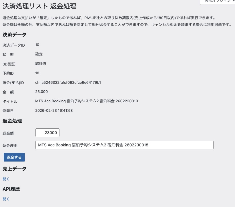 返金機能は、決済データに登録されたPAYJPの課金データIDに対して、支払実行から所定の期間内(180日)であれば有効です。詳細はPAYJPとの取り決めをご確認ください。